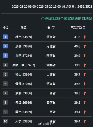 具体来看,19日,河南多地最高气温超过了40,气温最高的林州达到了43.2,并打破全省5月最高气温纪录。今天白天,河南仍有大范围高温天气,高温强度略有减弱,截至16时,林州最高气温为41.6,占据全国气温排行榜首位。20日,山西高温持续,截至15时,稷山、洪洞、霍州等地最高气温已达39以上。